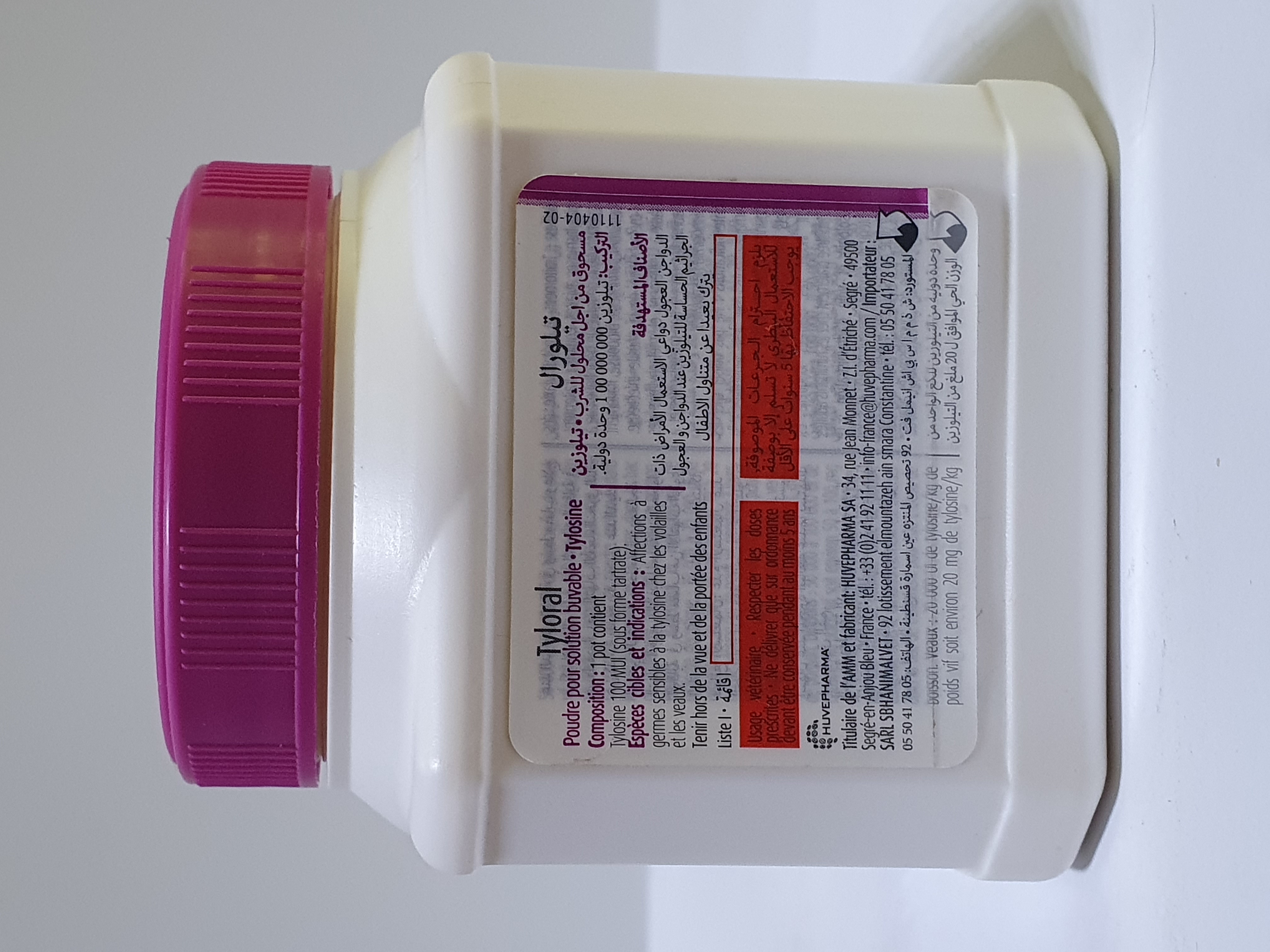 Poulets: Prévention de l'entérite nécrotique: 10 000 à 20 000 UI de tylosine / kg de poids vif, soit environ 10 à 20 mg de tylosine / kg de poids vif pendant 3 jours. La quantité totale de poudre contenue dans le conditionnement (100g) est à vider dans la cuve de traitement pour 1000 litres d'eau de boisson.