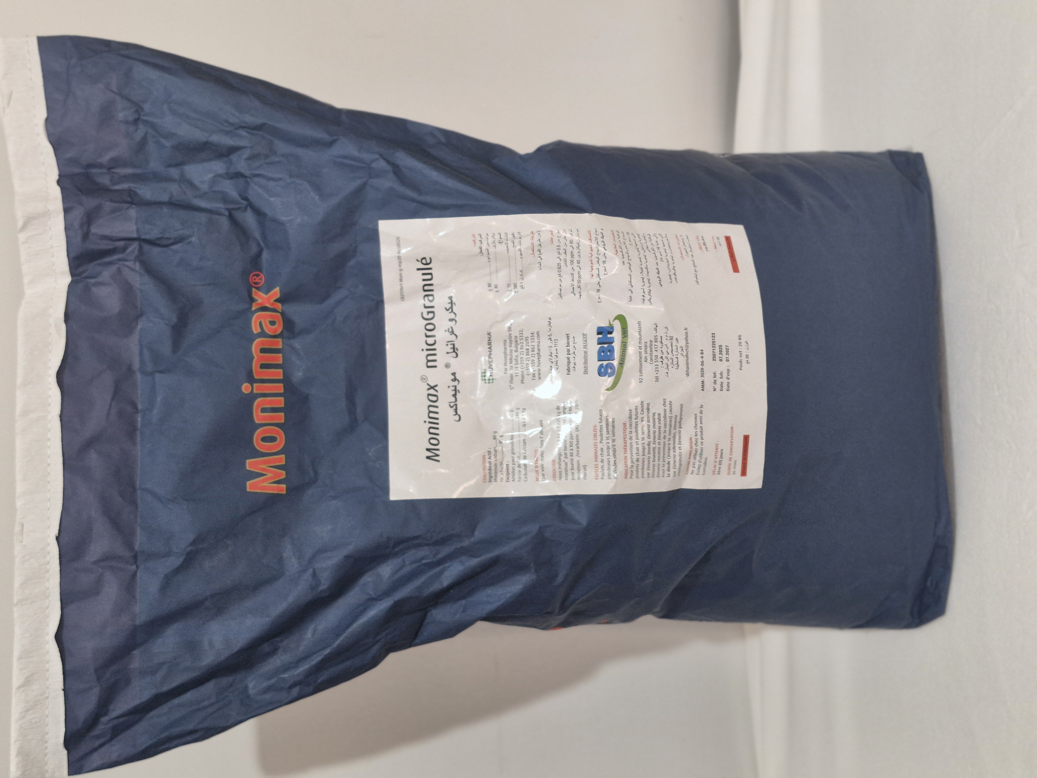 Nous melangons 0,5 kg a 0,625 kg de Monimax par tonne d'aliment complet pour fournir 80 à 100 ppm d'activité totale monensin/nicarbazin (40 à 50 ppm chacun)